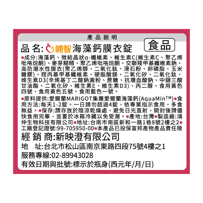 - 品 名:哺智海藻鈣膜衣錠