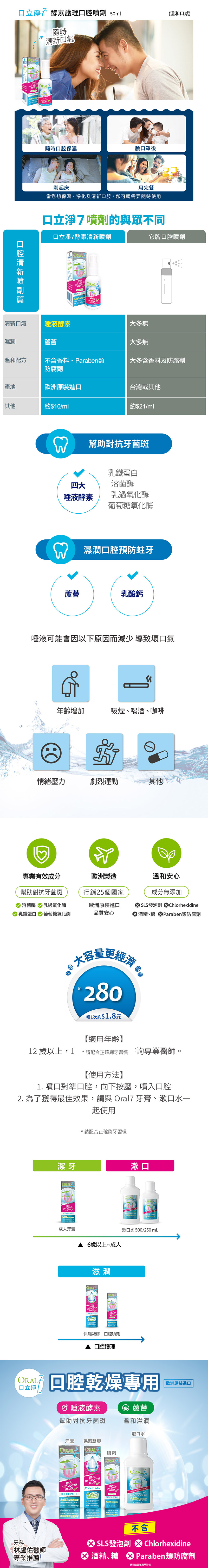 A. 因為口腔乾燥的人,口水比較少,口水內的酵素也比較少,所以口腔自潔能力比較不好,容易會有蛀牙、口氣不好等一連串口腔問題,而口立淨全系列就是含這些口腔原有的酵素,所以可以從根本強化口腔健康,是口腔乾燥首選品牌。
