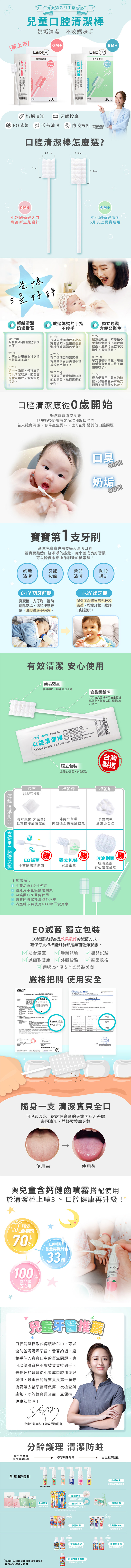 - 使用方式:搭配兒童含鈣健齒噴霧Plus或飲用水使用,浸潤棉棒後,即可清潔兒童口腔、奶垢、舌苔、齒垢,全面護理並按摩牙齦。