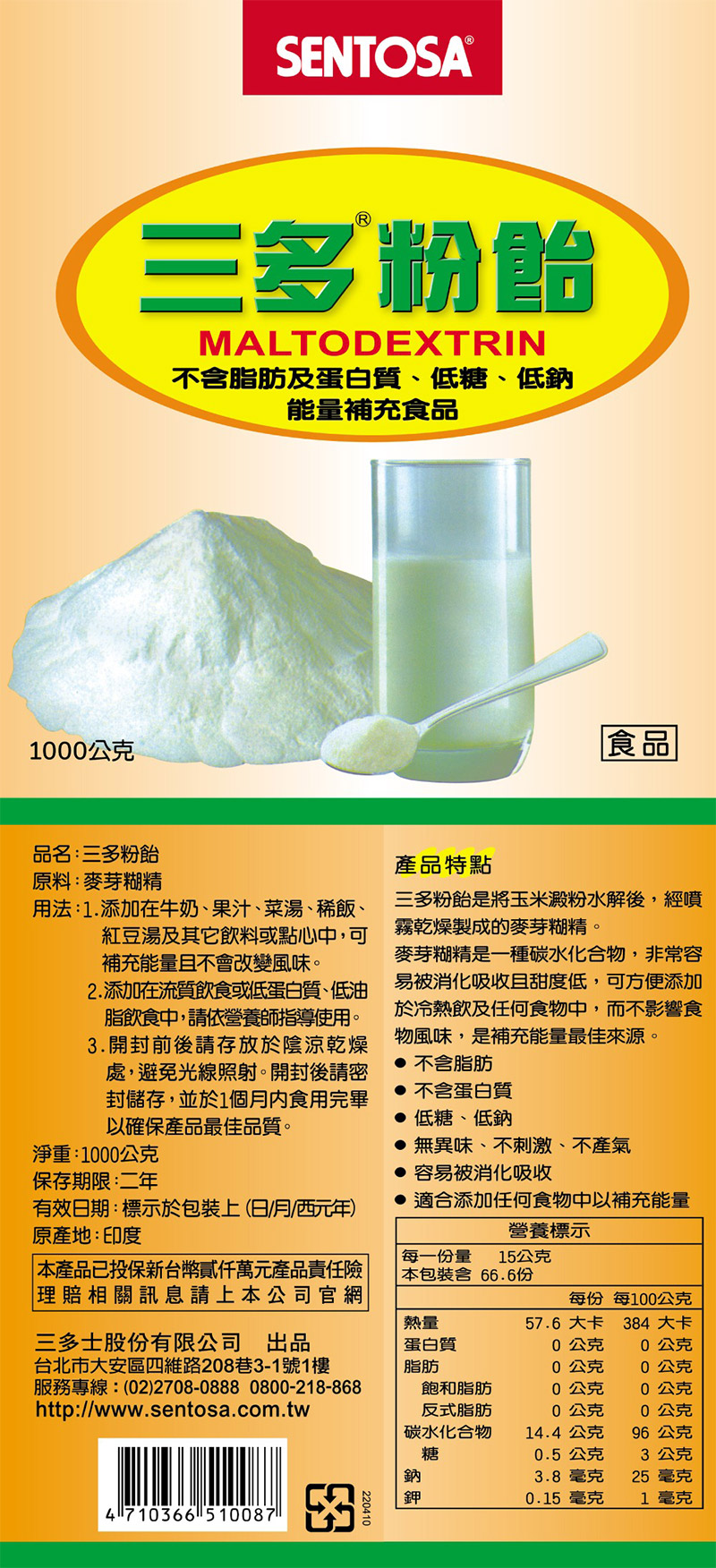 麥芽糊精是一種碳水化合物,非常容易被消化吸收且甜度低,可方便添加於冷熱飲及任何食物中,而不影響食物風味,是補充能量最佳來源。