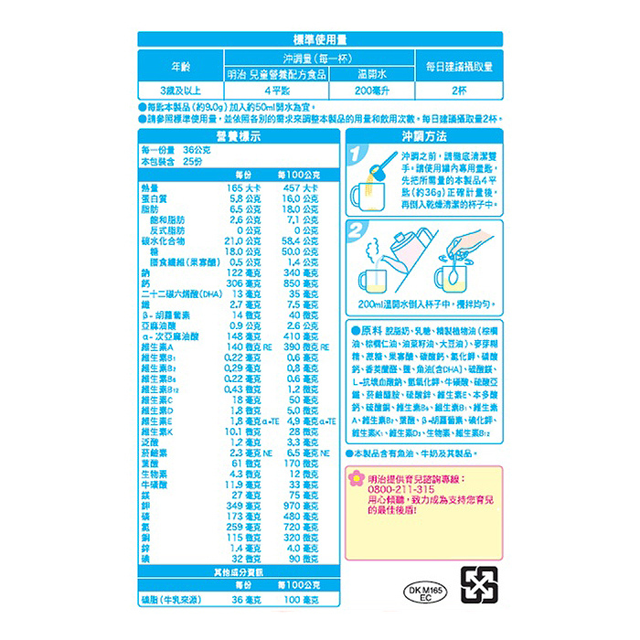 - 原 料:原料脫脂奶、乳糖、精製植物油(棕櫚油、棕櫚仁油、油菜籽油、大豆油)、麥芽糊精、蔗糖、果寡醣、碳酸鈣、氯化鉀、磷酸鈣、香莢蘭醛、鹽、魚油[含DHA]、硫酸鎂、L-抗壞血酸鈉、氫氧化鉀、牛磺酸、硫酸亞鐵、菸鹼醯胺、硫酸鋅、維生素E、本多酸鈣、硫酸銅、 維生素B6、維生素B1、維生素A、維生素B2、葉酸、β-胡蘿蔔素、碘化鉀、維生素K1、維生素D3、生物素、維生素B12